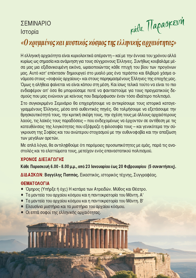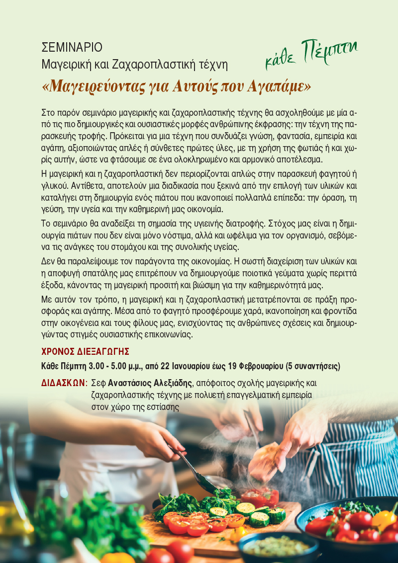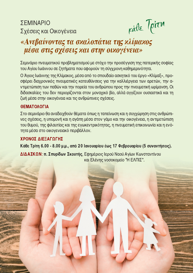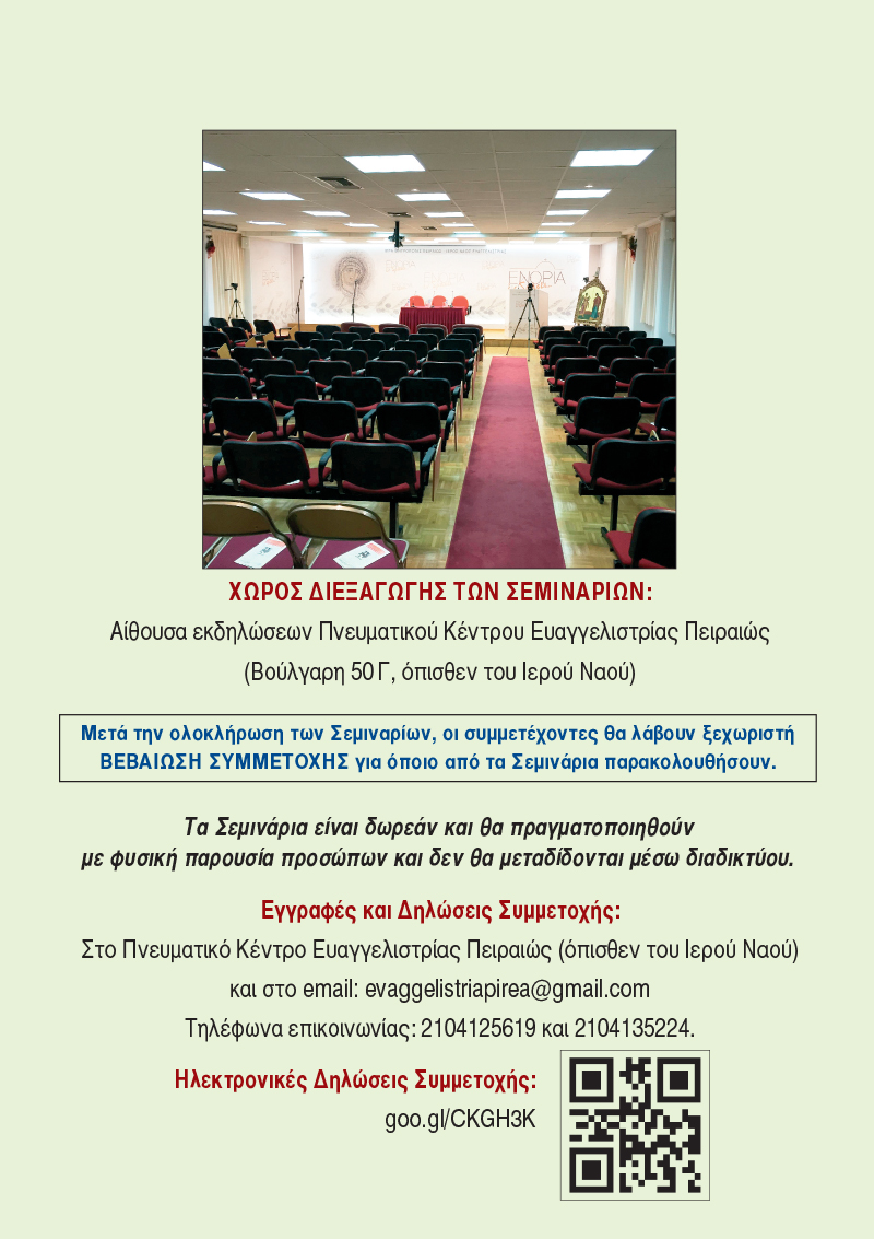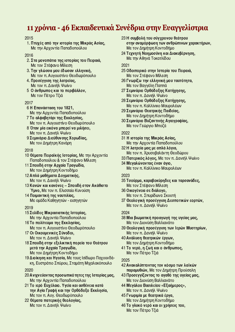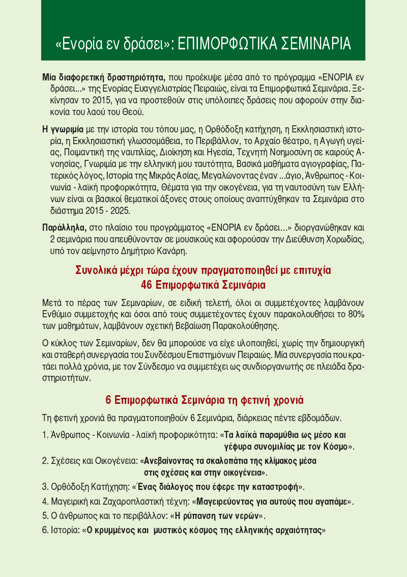 «ΕΝΟΡΙΑ εν δράσει»: 6 Επιμορφωτικά Σεμινάρια (19 Ιανουαρίου – 20 Φεβρουαρίου 2026 Date: 24 Δεκεμβρίου, 2025 in: Εκπαιδευτικά Σεμινάρια Post Views: 17 Related Posts Κυκλαδίτικο νησιώτικο γλέντι στο «ΕΝΟΡΙΑ εν δράσει…»Ένα ιδιαίτερο μουσικό αφιέρωμα παρουσιάστηκε την Πέμπτη 30 Νοεμβρίου, στο Πνευματικό Κέντρο του Ιερού Ναού… «ΕΝΟΡΙΑ εν δράσει»· 12 χρόνια εκκλησιαστικής μαρτυρίαςΜε την χάρη του Θεού, ολοκληρώθηκε το πρόγραμμα καθημερινών δραστηριοτήτων και εκδηλώσεων του Ναούμας, με… «ΕΝΟΡΙΑ εν δράσει 2024» 13 χρόνια εκκλησιαστικής μαρτυρίαςΜε την χάρη του Θεού, ολοκληρώθηκε το πρόγραμμα καθημερινών δραστηριοτήτων και εκδηλώσεων του Ιερού Ναού…