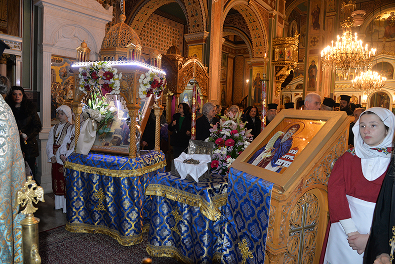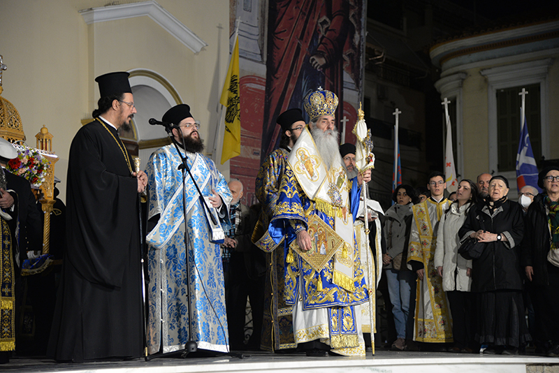 Αυτό το μυστήριο λοιπόν πανηγυρίζει η Αγία μας Εκκλησία, συνέχισε ο Σεβασμιώτατος. Αυτό είναι που συνεπαίρνει τους αγίους, που θεοποιεί τα σύμπαντα, που εκστασιάζει την όποια σκέψη μας, την όποια λογική μας. Μιλώντας ακολούθως για την θαυμαστή εμφάνιση της Παναγίας στον ναό της Ευαγγελίστριας κατά την αγρυπνία του Ευαγγελισμού το έτος 1929, όπου φανερώθηκε και προστάτευσε τους πιστούς. «Η Κυρία του κόσμου, η Μητέρα του Θεού και των ανθρώπων, άπλωσε το ιερό της μαφόριον. Και το κατέγραψαν το θαύμα πιστοί που ήταν οι αγρυπνούντες καθώς και οι αστυνομικές αρχές της εποχής. Και έμεινε στην ιστορία της πόλεως μας και της πίστεως μας δια των ημερησίων τότε εφημερίδων».
